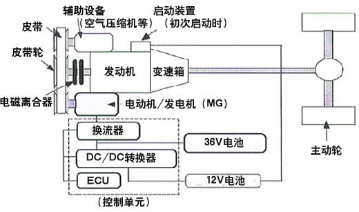 構成 由發動機,小型馬達(兼發電機)及驅動用36V電壓的小型2次電池構成,對各種不同車輛運行狀態下的電力進行測試。